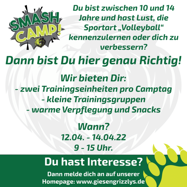 Meldet Euch online mit dem Anmeldeformular an oder schreibt uns unter: smashcamp@giesengrizzlys.de