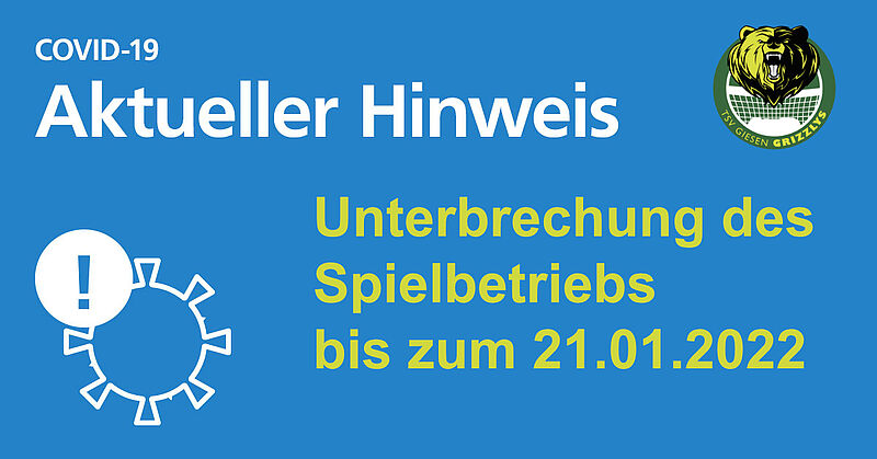 Der Trainings- und Spielbetrieb der Volleyballabteilung wird mit sofortiger Wirkung ausgesetzt. Das Präsidium des NWVV hat heute beschlossen, den gesamten Spielbetrieb/Jugendspielbetrieb mit sofortiger Wirkung bis zum 21.01.2022 zu unterbrechen. Dies betrifft alle Mannschaften der TSV GIESEN GRIZZLYS außer der 1. und 2. Herrenmannschaft, deren Spielbetrieb in der 1. Bundesliga/Dritten Liga unter die Zuständigkeit des DVV fällt und unter Beachtung der 2G plus – Regelung zunächst weitergeführt wird.