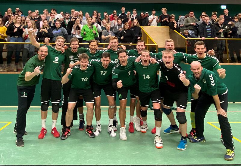 Am Samstagabend stand das Spitzenspiel der Superzweiten gegen die VSG Ammerland an. Im Vorfeld machte die Giesener Mannschaft ordentlich Werbung für dieses Spiel und es zahlte sich aus. Über 250 Zuschauer pilgerten in die Schachtarena und sorgten für eine beeindruckende Atmosphäre bei diesem Spitzenspiel. Die Mannschaft um Trainer Stefan Drews, der ohne seinen Co-Trainer Uwe Bödder auskommen musste, fand von Beginn an gut ins Spiel. Beflügelt von der tollen Stimmung in der Halle setzte die Mannschaft von Beginn an den gegnerischen Annahmeriegel unter Druck und fand im Angriff immer wieder die richtigen Lösungen. Vor allem Diagonalspieler Jannik Lehmann setzte zum Anfang des Spiels einige Highlights mit krachenden Sprungaufschlägen und harten Angriffen. Damit stellte er die Ammerländer immer wieder vor unlösbare Probleme. Die Mittelblockachse um Dominik Jennati und Hubert Naraniecki konnte im Block immer wieder zupacken und hinten zeichnete sich Libero Tove Jannsen, dank seiner neuen Armschoner, mit zahlreichen Abwehraktionen aus. Die Giesener Mannschaft machte dazu kaum Eigenfehler, sodass der erste Satz klar mit 25:17 für sich entschieden werden konnte. Die Zuschauer waren begeistert, aufgrund der spielerischen Überlegenheit des TSV. Im zweiten Satz wurde die Partie ausgeglichener, die Ammerländer erhöhten ihre Qualität und somit wurde es das erwartete Spiel auf Augenhöhe. Die Giesener streuten nun ein paar Fehler mehr im Angriff ein und so konnte sich keine Mannschaft bis zum Satzende absetzen. Nach zwei strittigen Entscheidungen des Schiedsgerichts kochten nun auch die Emotionen hoch und die Spannung war zum Greifen nah. Beim Stand von 24:23 hatte Ammerland einen Satzball und nur dank des frisch eingewechselten Diagonalangreifers Alexander Grüne konnte der Gast diesen nicht verwerten. Er sorgte mit einer spektakulären Abwehr und dem darauffolgenden Angriffspunkt für den Ausgleich. Danach war es an Außenangreifer Jannik Schiller, der mit einem clever gelegten Ball und einem harten Diagonalangriff den Satz zugunsten der Giesener entscheiden konnte und damit die Halle zum Beben brachte. Die Mannschaft um Kapitän Jonathan Lehmann war nun fest entschlossen mit dem nächsten Satz das Spiel zu beenden. Nach Startschwierigkeiten konnte die Mannschaft den Fans nochmal zeigen, warum sie unangefochten auf dem ersten Platz stehen. Sie konnten immer wieder aus einer perfekten Annahme heraus über die Außen und Diagonalposition punkten und stellten die Ammerländer mit ihren Sprungaufschlägen weiter vor Probleme. Doch der Gast gab sich bis zum Schluss nicht auf und kämpfte verbissen um jeden Punkt. Doch auch im dritten Satz hieß der Sieger TSV Giesen. Direkt den ersten Matchball konnte Punktegarant Jannik Lehmann zum 25:22 verwerten und verwandelte die Schachtarena in eine Partymeile. Die Mannschaft fiel sich erleichtert in die Arme und wusste wie vorentscheidend dieser Sieg im Kampf um die Tabellenspitze war. Mit zwölf Punkten Vorsprung bei sechs ausstehenden Spielen sieht es für die Superzweite durchweg positiv aus für eine erneute Rückkehr in die 3.Liga.