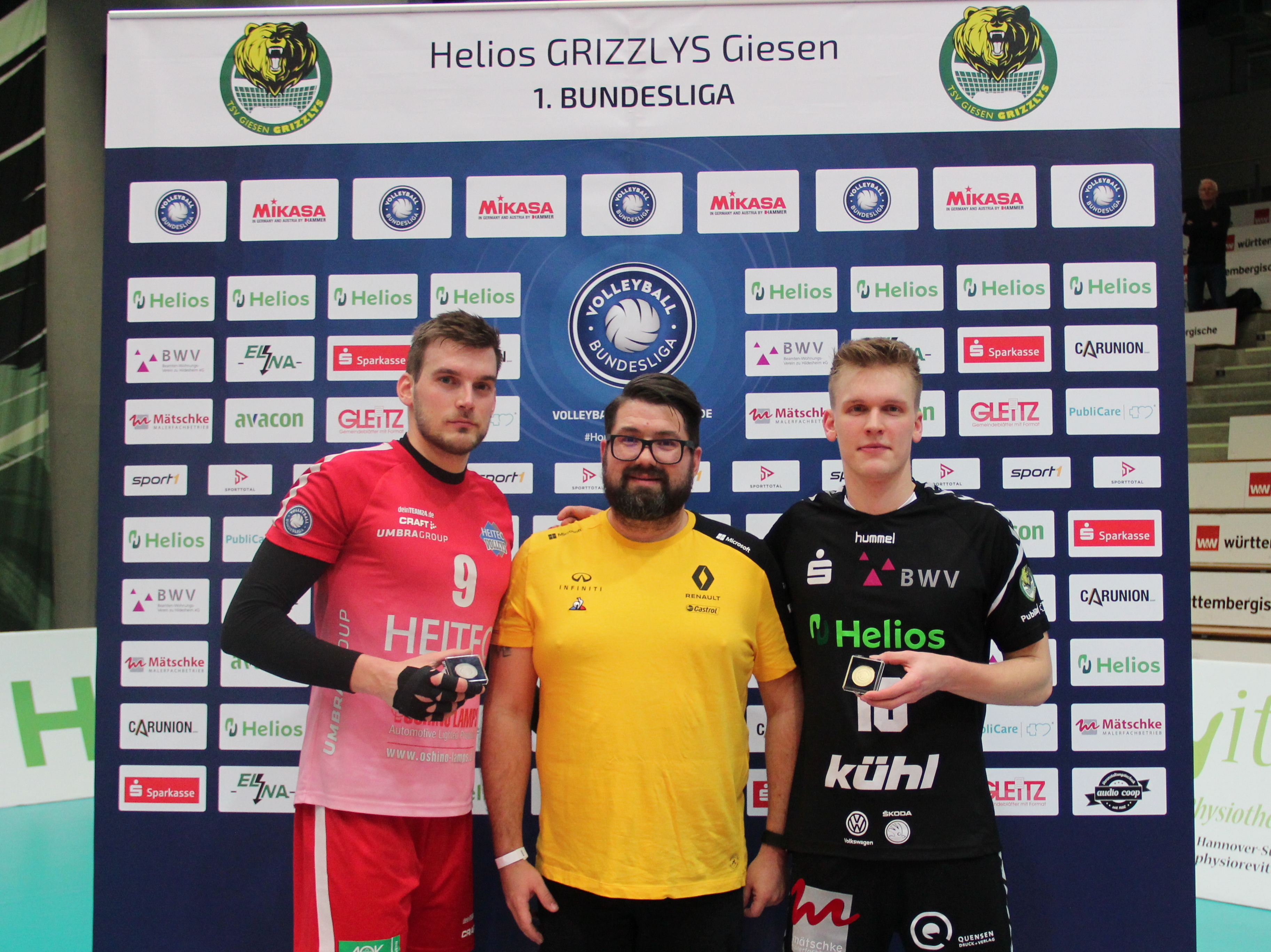 Im dritten Satz wirkten die GRIZZLYS von Beginn an wieder konzentrierter und kämpften um jeden Punkt. Nach mehreren Rettungsaktionen und daraus folgenden langen Ballwechseln gingen die Teams mit 8:4 in die erste technische Auszeit. Eltmann hatte Giesen in dieser Phase in allen Bereichen wenig entgegenzusetzen. Beim Team von GRIZZLYS-Coach Itamar Stein klappte nun fast alles. Beim Stand von 13:6 nahmen die HEITEC Volleys eine Auszeit, es änderte sich allerdings trotzdem wenig im Spiel. Beim Stand von 16:8 kam Robert Schramm für den starken Magloire Mayaula ins Spiel. Nach einem Ass von Wieczorek folgte die nächste Auszeit der Gäste (19:11). Stein brachte nun Milan Hrinak ins Spiel. Eltmann bäumte sich danach noch einmal gegen die drohende Niederlage auf, gewann drei Punkte in Folge und zwang Giesen so zu einer Auszeit. Danach lief es wieder besser für die GRIZZLYS und man ließ den Vorsprung nicht weiter schmelzen. Nach einem Punkt von John Moate hatten die GRIZZLYS mehrere Matchbälle (24:18). Den zweiten Nutze Johnathan Moate, der die Partie so mit einem Schnellangriff beendete. Nach 80 Minuten endete das Spiel mit 3:0 (25:22, 25:20, 25:19) für die Helios GRIZZLYS Giesen. Der Spieltagssponsor Carunion verlieh die MVP-Medaillen nach dem Spiel an Tomas Halanda (Silber) und GRIZZLY-Zuspieler Jan Röling (Gold).