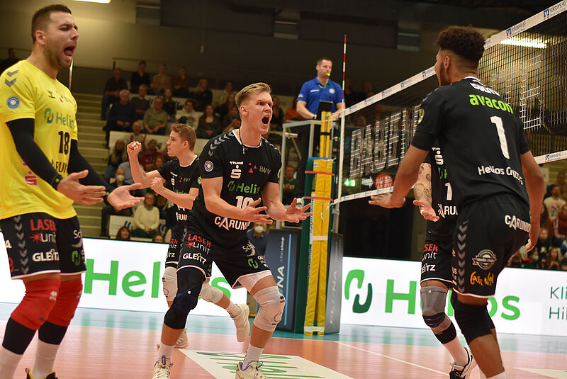 Im ersten Satz hielten die Gastgeber lange mit den Berlinern mit. Doch ab Mitte des Satzes, zeigten die Hauptstädter ein ums andere Mal ihre sportliche Klasse. Gerade Diagonal Angreifer Marek Sotola wurde eindrucksvoll von Ausnahmezuspieler Sergey Grankin in Szene gesetzt. Am Ende verwandelten die Berliner ihren zweiten von vier Satzbällen nach 26 Minuten zum 21:25.