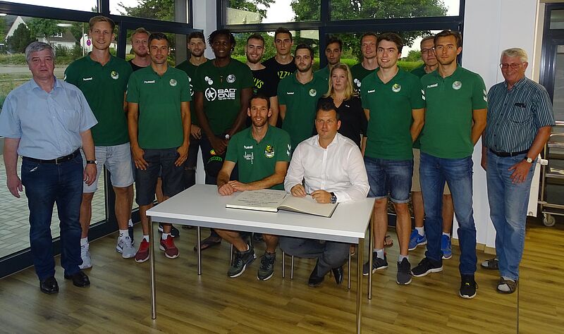 Die Giesener Voleyballer „Helios Grizzlys“ haben sich vor 10 Jahren nach dem 1. Aufstieg in die 1. Bundesliga schon einmal in das erste Goldene Buch eingetragen. Natürlich war jetzt der erneute sportliche Aufstieg in die 1. Bundesliga Anlass für Bürgermeister Andreas Lücke, das erfolgreiche Sportteam des TSV Giesen einzuladen. Er lobte nicht nur den Erfolg der Mannschaft, sondern hob die Bedeutung des Zusammenspiels von Spielern, Management, Helferteam und Fans hervor. Im Beisein von Vertretern des Rates, des Ortsrates und der Verwaltung lobte er auch die Erweiterung und Umgestaltung der Giesener Sporthalle, die auch den Volleyballern weitere Gestaltungsmöglichkeiten biete. Er wünschte der Mannschaft viel Erfolg und vor allem den Klassenerhalt in der 1. Bundesliga. Er freute sich, dass auch zwei Bundesligaspiele in der Giesener Mehrzweckhalle ausgetragen werden.