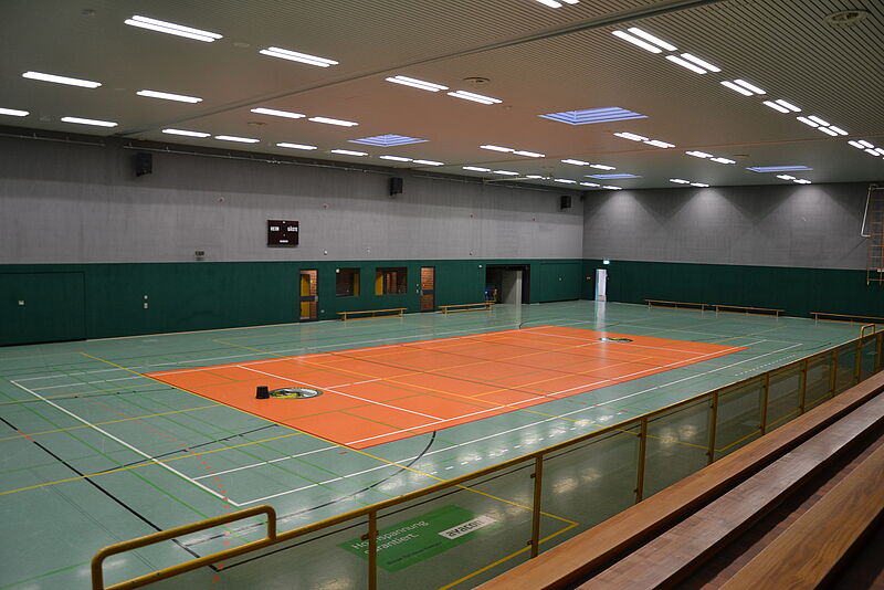 Die Mannschaft, die auf dem vorderen Feld trainiert, geht vorne über den Haupteingang in die Halle. Die Mannschaften auf den hinteren beiden Dritteln gehen über den Kabinengang am Regieraum vorbei über den Seiteneingang in die Drittel 2 und 3.