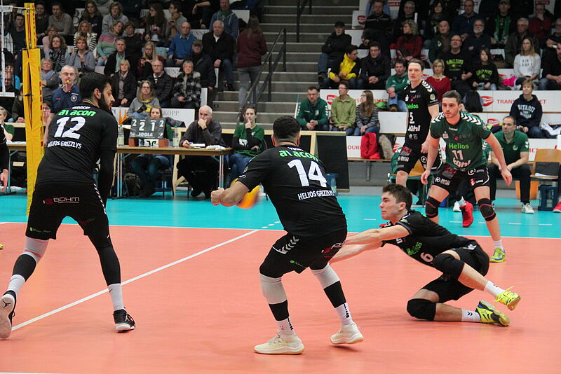 Aber zum Spiel. HELIOS GRIZZLYS-Trainer Itamar Stein startete mit Henrik Behmenburg und Robert Schramm auf der Mittelposition. Dazu kamen Zuspieler Stefan Thiel und die Außenangreifer Marius Appel sowie Milan Hrinak. Marcel Fode auf der Liberoposition, Kapitän Hauke Wagner als Diagonalspieler und Libero Marcel Fode gingen ebenfalls in die Partie.