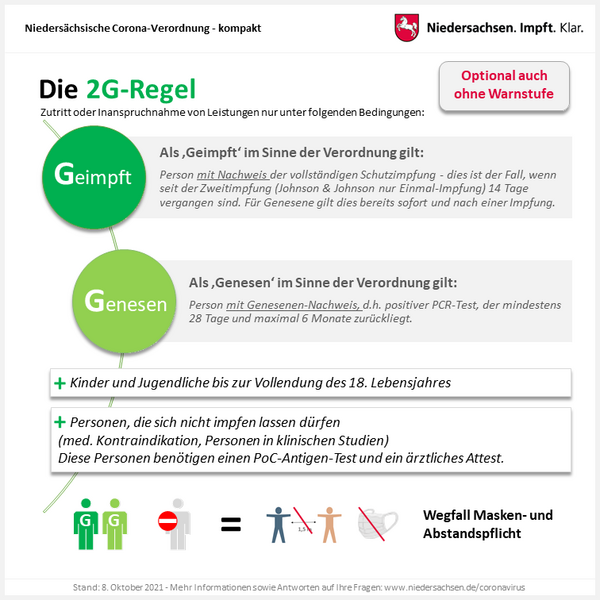 Am Eingang wird der Impf- oder Genesenennachweis kontrolliert. Kinder und Jugendliche zwischen 7 und 18 Jahren sowie alle Personen die sich nicht impfen lassen dürfen müssen einen Testnachweis (und ggf. Attest) erbringen. Die jeweiligen Nachweise sind nur in Kombination mit einem amtlichen Ausweis gültig.