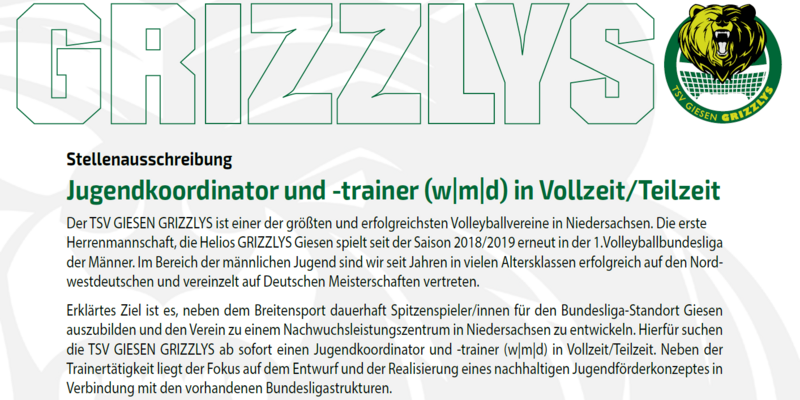 Ziel ist es, neben dem Breitensport dauerhaft Spitzenspieler/innen für den Bundesliga-Standort Giesen auszubilden und den Verein zu einem Nachwuchsleistungszentrum in Niedersachsen zu entwickeln. Hierfür suchen die TSV Giesen GRIZZLYS ab sofort einen Jugendkoordinator und -trainer (w|m|d) in Vollzeit/Teilzeit. Neben der Trainertätigkeit liegt der Fokus auf dem Entwurf und der Realisierung eines nachhaltigen Jugendförderkonzeptes in Verbindung mit den vorhandenen Bundesligastrukturen.
