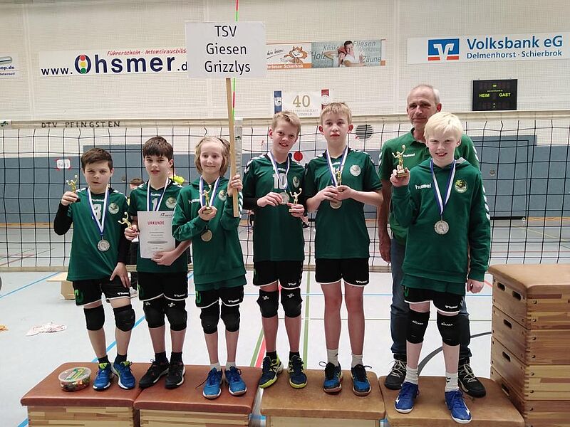 Qualifiziert hatte sich die Mannschaft im Vorfeld durch Siege bei den Südbezirks- und Bezirksmeisterschaften. In der Gruppenspielphase konnten zwei deutliche 2:0 Siege gegen die Teams aus Salzgitter und Delmenhorst eingefahren werden. Auch das Überkreuzspiel gegen Hondelage ging mit 2:0 an den Nachwuchs vom Kaliberg. Damit war ein Platz auf dem Treppchen sicher. Die Partie gegen den späteren Turniersieger Eiche Horn verloren die Giesener deutlich mit 0:2. Da es der Mannschaft vom VC Tecklenburg genauso erging, ging es im letzten Spiel um die Silbermedaille. Den ersten Satz konnte der VC Tecklenburg für sich verbuchen und führte auch im zweiten Durchgang schon mit fünf Punkten Abstand. Doch durch eine kämpferische Mannschaftsleistung und angefeuert von den Jungs des Gfl Hannover und den mitgereisten Fans konnten die Jung-Grizzlies das Spiel drehen und am Ende im Tiebreak knapp mit 15:13 für sich entscheiden.