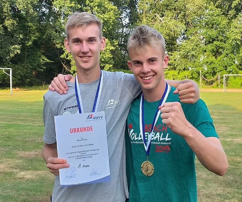 Young-GRIZZLY Julien Grahn hat ein extrem erfolgreiches Wochenende hinter sich. Mit seinem Beachpartner Finn Mroß aus Northeim spielte er am vergangenen Wochenende sowohl die Nordwestdeutschen Beachmeisterschaften der U18 als auch die der U17. Am Samstag lief es trotz geringer Erwartungen erstaunlich gut und das Team biss sich, trotz älterer Konkurrenz, durch bis ins Finale. Hier mussten sie sich jedoch dem Team Mohwinkel/Pundt aus Lüneburg/Ammerland geschlagen geben. Am Sonntag wirkte das Team Grahn/Mroß noch konzentrierter. Im 16er-Feld gab sich das Team keine Blöße und gewann dieses Mal auch das Finale. Beide Titel und die Qualifikation für die Deutschen Meisterschaften wurden Sonntag Nachmittag ordentlich gefeiert.