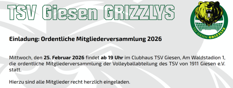 Mittwoch, den 25. Februar 2026 findet ab 19 Uhr im Clubhaus TSV Giesen, Am Waldstadion 1, die ordentliche Mitgliederversammlung der Volleyballabteilung des TSV von 1911 Giesen e.V. statt.