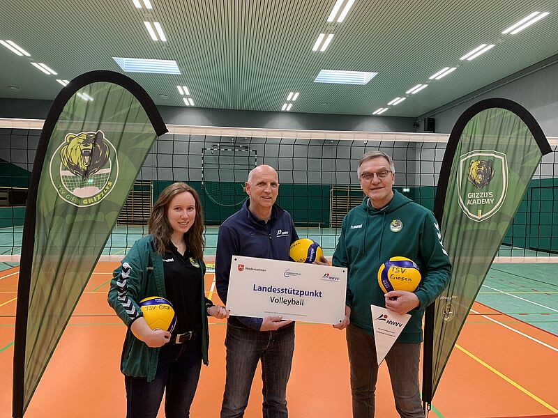 Die TSV Giesen GRIZZLYS haben mit dem Nordwestdeutschen Volleyball-Verband (NWVV) im Sommer letzten Jahres eine Kooperationsvereinbarung abgeschlossen, um die Nachwuchsarbeit in der Region Hildesheim zu fördern. Diese schließt sowohl die Volleyballabteilung der TSV Giesen GRIZZLYS, als auch das Bundesligateam, die Helios GRIZZLYS, mit ein. Die Schwerpunkte dieser Vereinbarung sind die Mitglieder- und Nachwuchs[1]gewinnung mit Projekten in Schulen und Vereinen, die Nachwuchsleistungssportförderung und die Vereins- und Strukturentwicklung mit Kooperationen mit Vereinen und Projekten in der Region. Im Rahmen dieser Kooperationsvereinbarung erhalten die TSV Giesen GRIZZLYS den Status des Landesstützpunktes und Nachwuchsleistungszentrums. Dieses ist jetzt auch für Alle nach außen sichtbar. " Ich freue mich den TSV Giesen GRIZZLYS jetzt auch als äußeres Zeichen der Kooperation das offizielle Stützpunktschild des Nordwestdeutschen Volleyballverbandes überreichen zu können.", so Landestrainer Uwe Wallenhorst bei der Schildübergabe in der Giesener "Schachtarena". „Die Anerkennung als Landestützpunkt Halle und Beach des NWVV sehen wir auch als Auszeichnung für unsere umfangreiche und erfolgreiche Nachwuchsarbeit- und Förderung in den letzten Jahren. Darauf sind wir sehr stolz.“, so Abteilungsleiter Dr. Stefan Rössig und Jugendkoordinatorin Celine Hoja bei der Übergabe. Erste Maßnahmen sind die Erweiterung der bereits bestehenden Schul-AG´s im Raum Hildesheim/Hannover und die Sichtung von Kindern und Jugendlichen in Schulen durch unsere Nachwuchstrainer. Mitte Mai startet dann das Stützpunktraining auf der Beachanlage, nach den Sommerferien das Kadertraining in der Halle.