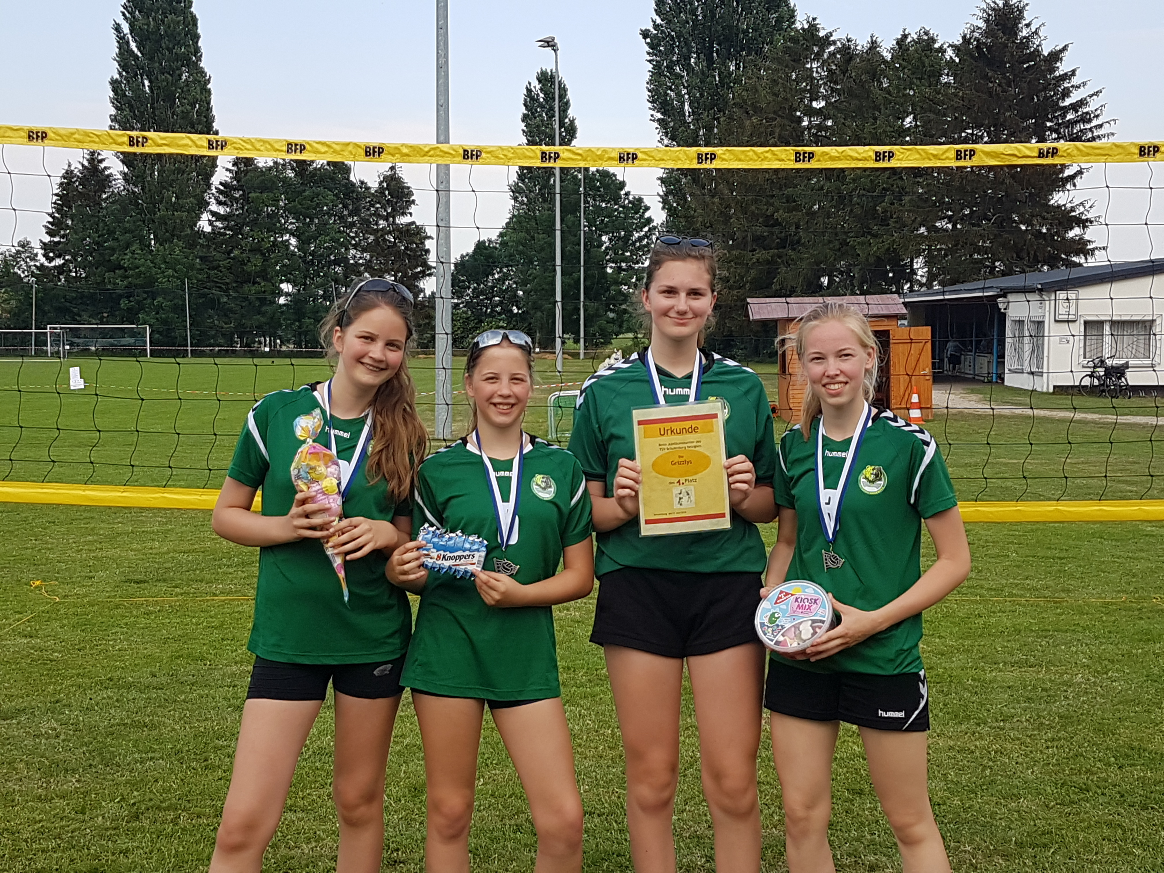 Anlässlich des 80igsten Jubiläums des TSV Schulenburgs fand am letzten Samstag von 14.00 - 18.00 h ein Rasenvolleyballturnier auf dem Schulenburger Sportplatz statt, zu dem die Giesen Grizzly Girls eingeladen waren. Gespielt wurde mit vier, z.T. gemischten 4er-Teams bis 16 Jahre. Für das leibliche Wohl war bestens gesorgt, fand doch parallel ein grosses Jugendfussballturnier statt.