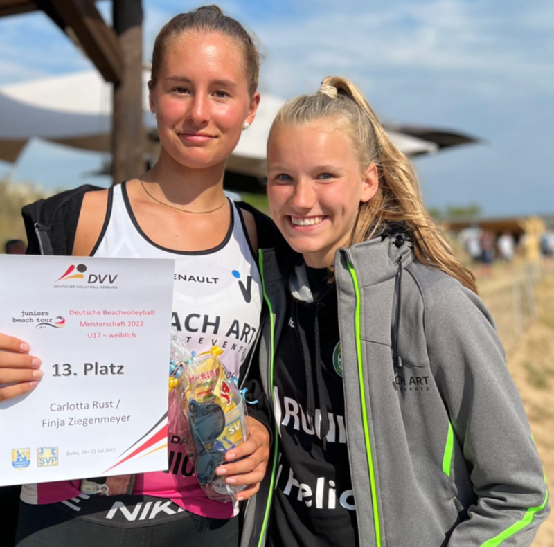 Bei den Mädchen tritt Finja Ziegenmeyer als Athletin der GRIZZLYS Beach Academy erneut mit Ihrer neuen Partnerin Carlotta Rust vom Volleyball Regionalkader Paderborn an. Sie konnten schon am vergangenen Wochenende bei der U17 einen sehr guten 13. Platz feiern. Finja Ziegenmeyer ist froh nach Ihrer Fußverletzung im Mai wieder voll rehabilitiert zu sein und hat an diesem Wochenende mit Ihrer Partnerin Einiges vor. Das Ziel ist es in jedem Falle die Gruppenphase erfolgreich zu überstehen und dann in der Gewinnerrunde möglichst weit zu kommen.
