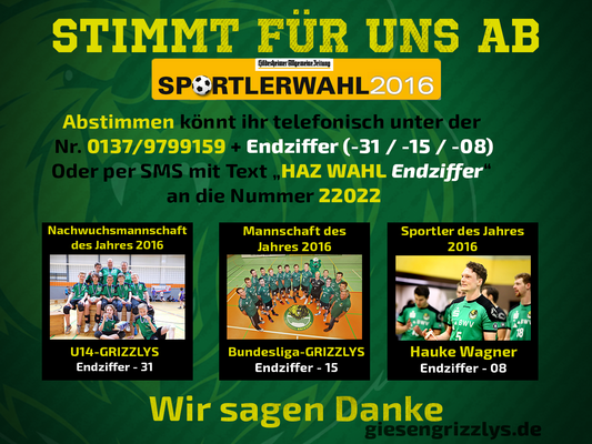 Auch in diesem Jahr veranstaltet die Hildesheimer Allgemeine Zeitung wieder ihre Sportlerwahl. Gleich in drei Kategorien sind GRIZZLYS nominiert: